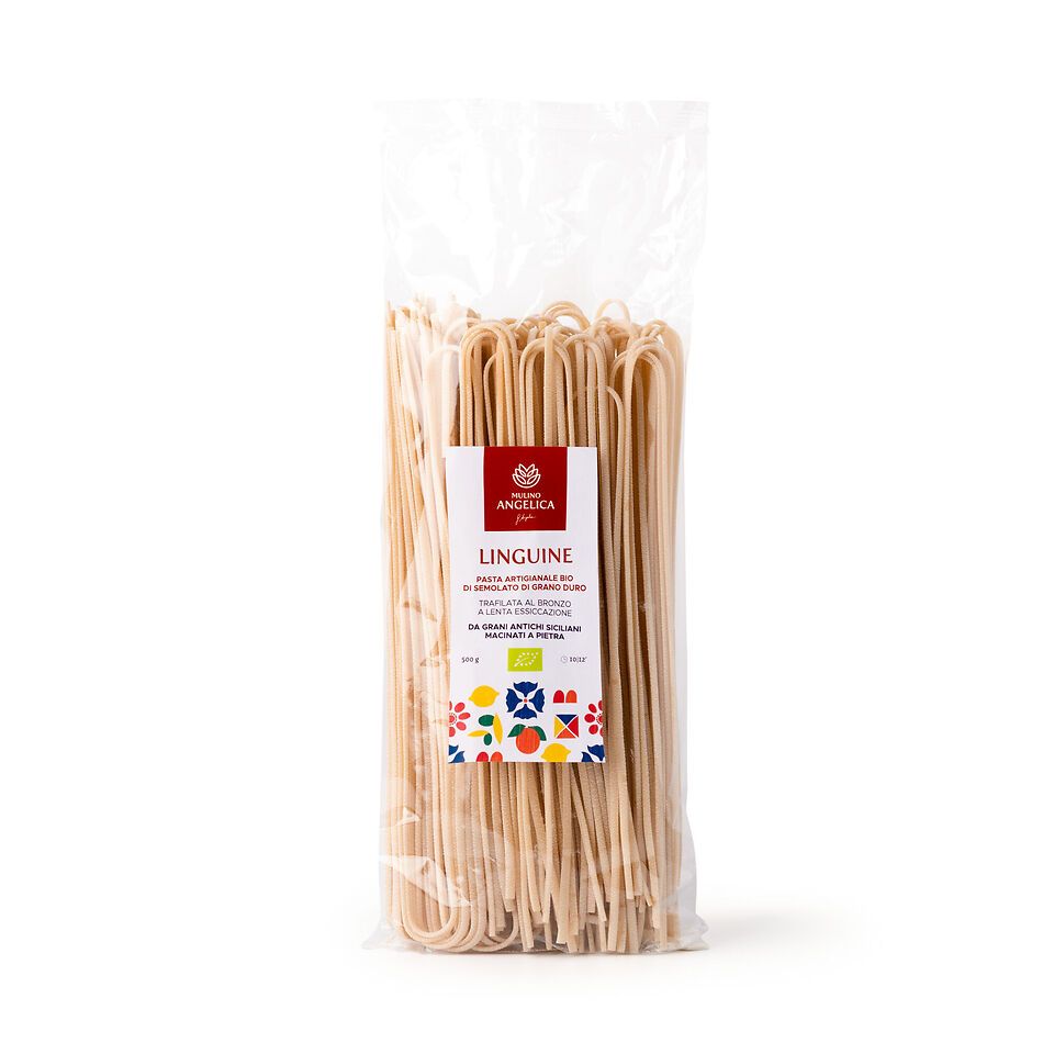 Le Linguine di Mulino Angelica nascono dalla selezione accurata dei nostri semolati di grani antichi siciliani. Trafilata a bronzo e lasciata essiccare lentamente, a bassa temperatura, questa pasta artigianale è un prodotto d’eccellenza che può scatenare la vostra fantasia in cucina ed è perfetta per dar vita a un primo di mare da leccarsi i baffi.